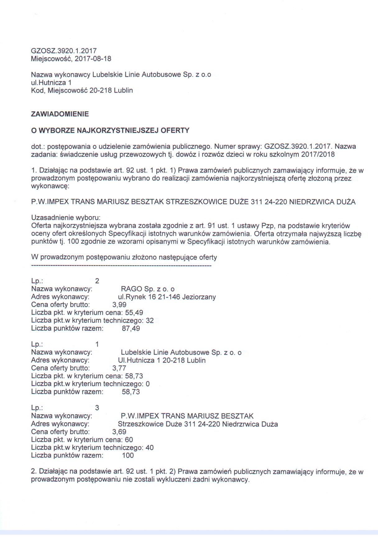 Wykonawcy, którzy nie złożyli nowych postąpień, zostaną zakwalifikowani do następnego etapu: